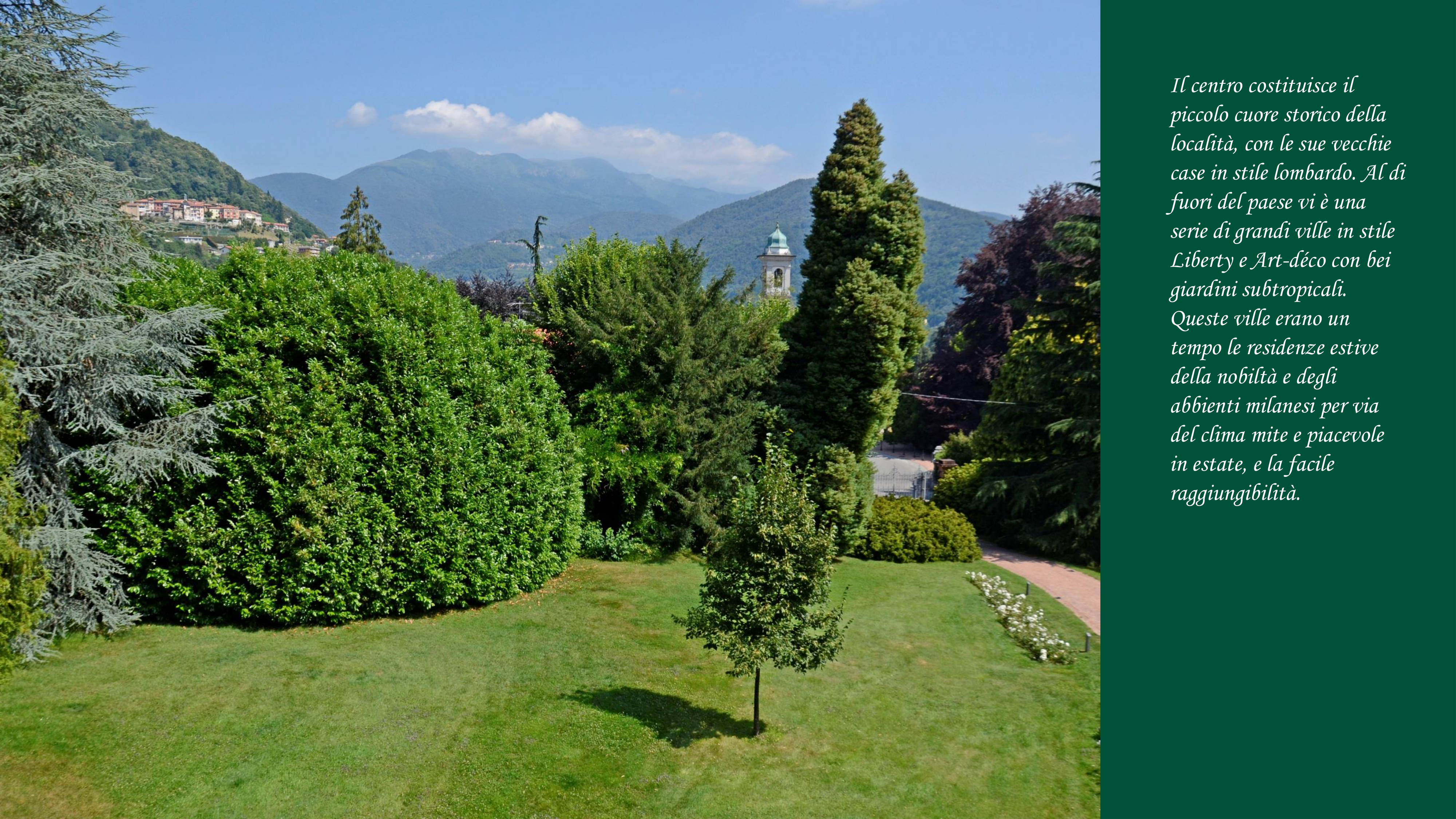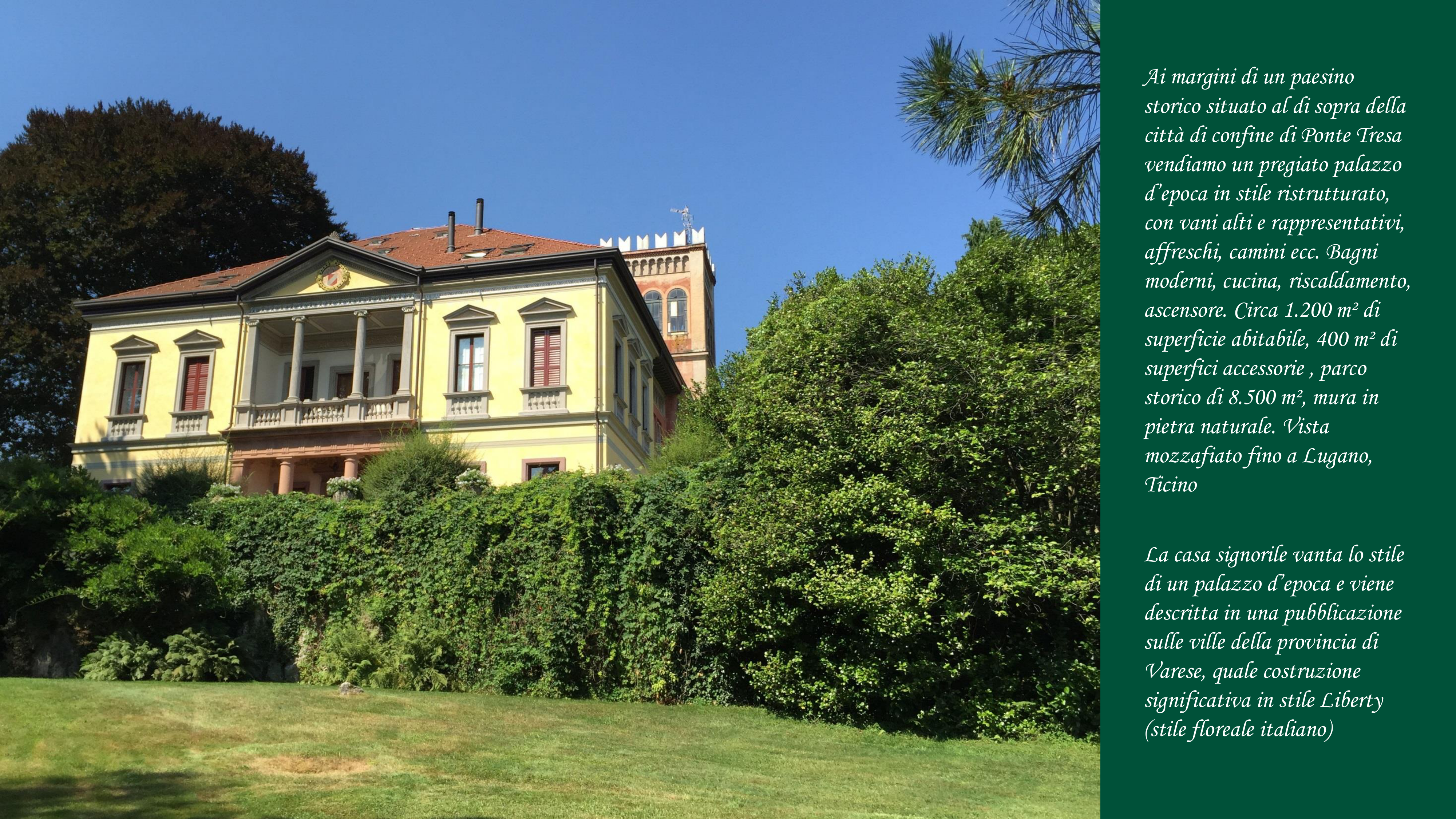 Inserita in un contesto di ville e giardini Liberty e Art D├®co, questa residenza gode di vedute straordinarie che si estendono fino a Lugano e al Ticino. La posizione unisce prestigio e riservatezza, caratteristiche essenziali per una propriet├á destinata a un pubblico esigente.